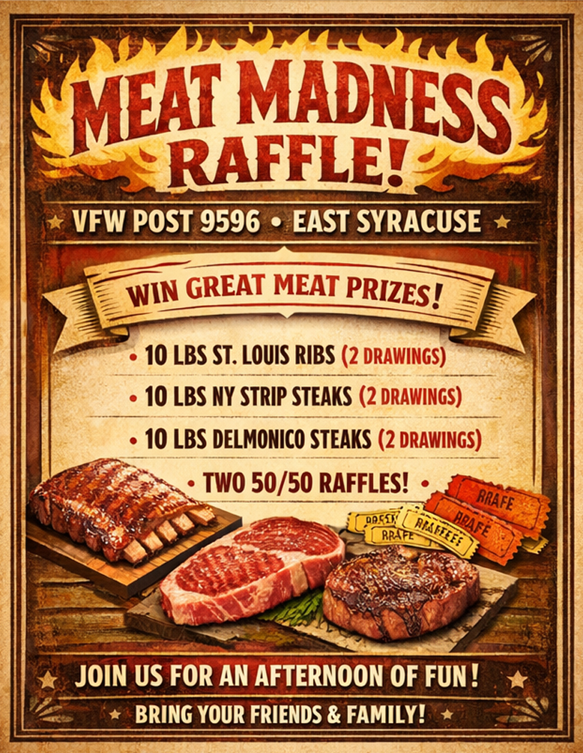 Meat Madness Raffle is on Saturday April 11th starting at 3PM.